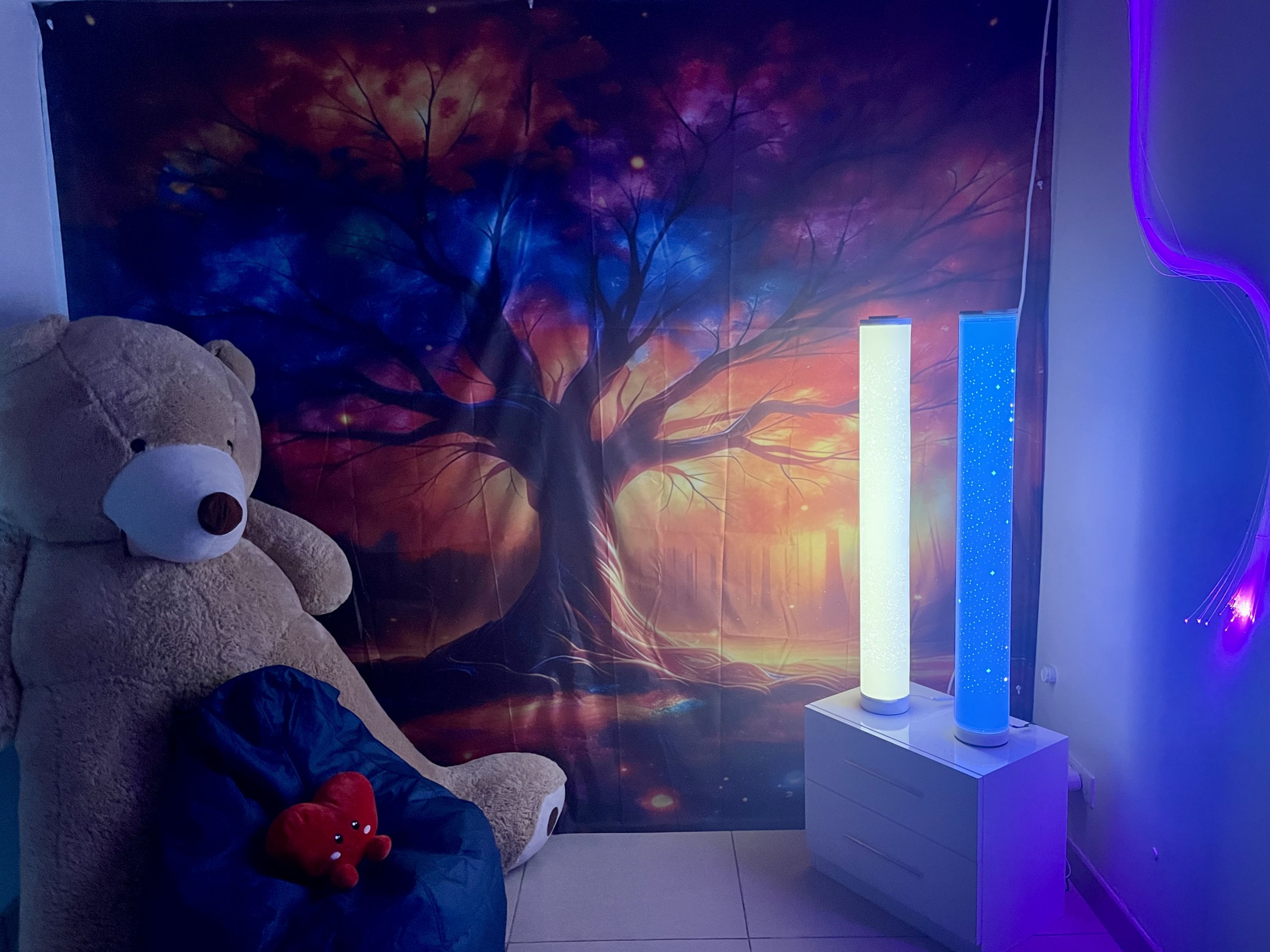 Pour accueillir les enfants dans les meilleures conditions, j'ai aménagé une salle multi-sensorielle au sein de mon cabinet. Baignée de lumières douces et changeantes, habillée de tentures évoquant des univers imaginaires, cet espace invite à la détente et à l'apaisement. Un grand nounours veille, rassurant, tandis que des projections lumineuses au plafond captivent le regard et favorisent le lâcher-prise.
